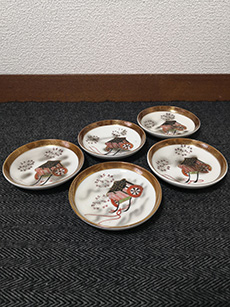 五彩手(通称九谷五彩)という色鮮やかな上絵付けが特徴的な九谷焼の小皿五枚セット。